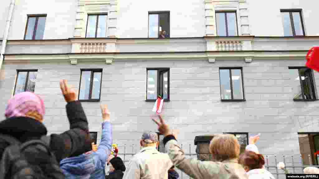 У здания вуза пенсионеры скандировали: "Бабушки за вас", "Студенты – наша гордость" и "Жыве Беларусь!" Студенты встретили пенсионеров криками благодарности и бело-красно-белыми флагами из окон, сообщает TUT.BY.