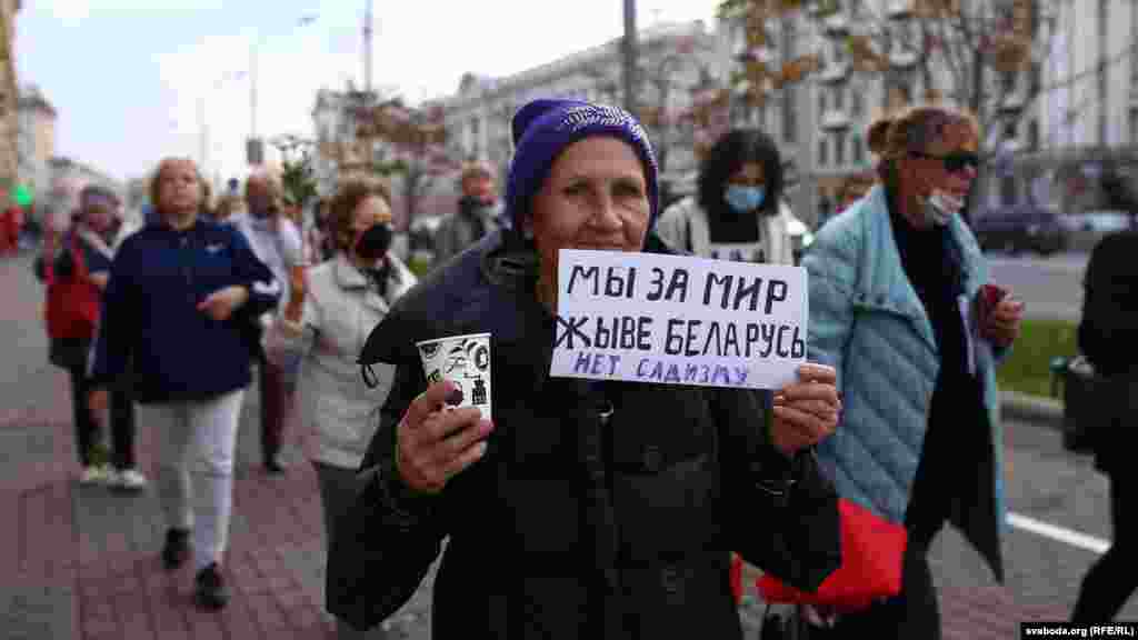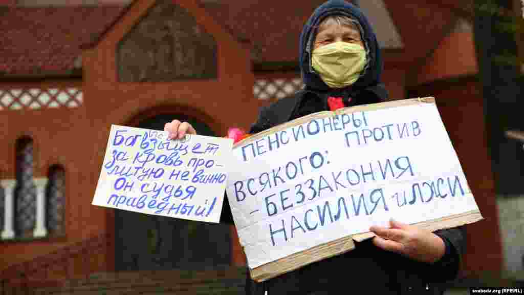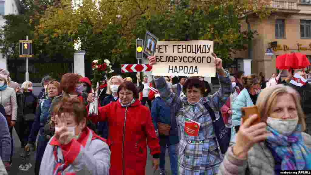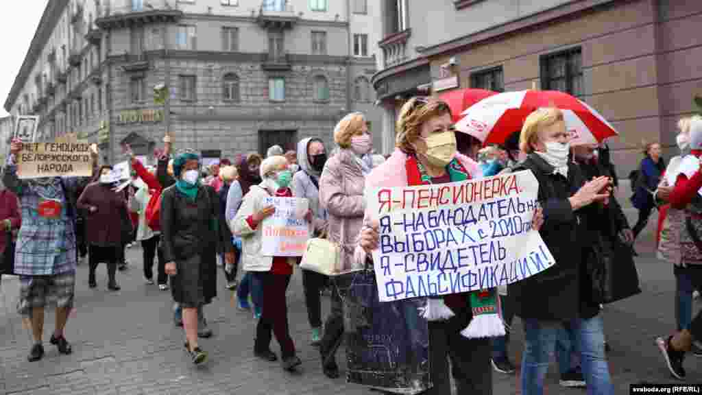Участники марша несли плакаты "Пенсионеры за перемены", "Нет геноциду белорусского народа", "Я не верю Лукашенко, БТ, RT и депутатам, верю своим детям и Светлане Алексиевич", "Пенсионеры против беспредела, насилия и лжи".