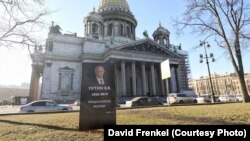 Напротив Исаакиевского собора в Санкт-Петербурге появилась стилизованная под надгробие табличка с изображением президента России Владимира Путина. На ней указаны дата рождения главы государства и – через дефис – цифра "2019". Ниже написано "Предал народ России".